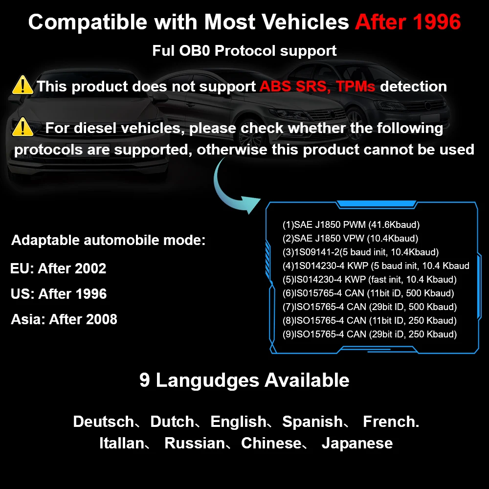 Even though it compatible with most cars, but different regions support the vehicle OBD2 protocol at different times, or some car is special design, so it may not compatible with some cars which do not support OBD2 protocol. Especially Japanese and Korean car brand. And this device only have OBD2 Functions, don't have Special Functions, like ABS Reset, Airbag Reset... Please leave us message in below format, we will reply you ASAP. For example : xx, 2005, 2.0cc, Diesel.
